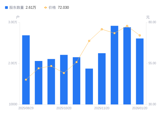 1月29日消息,数据显示,截至2026年1月20日,中富电路A股股东总户数为2.61万户,较上期(2026年1月9日)减少2738户,降幅9.50%。公司最新A股总股本为1.91亿股,其中流通A股1.91亿股,户均持有流通A股数量为7341.52股,较上期增加697.64股,增幅10.50%;户均持流通A股市值52.88万元,较上期增加1.18万元,增幅2.29%。