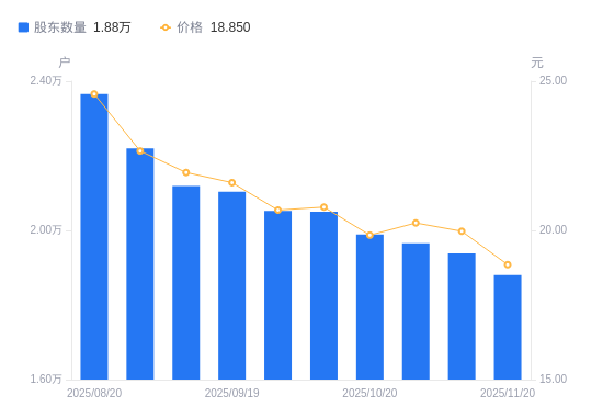 近一年(2024年11月20日至2025年11月20日),双飞集团A股股东户数从1.37万户,增加至1.88万户,增幅37.31%,区间股价上涨44.22%。