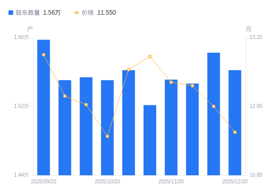 近一年(2024年12月31日至2025年12月20日),北鼎股份A股股东户数从1.71万户,减低至1.56万户,降幅8.79%,区间股价上涨15.66%。