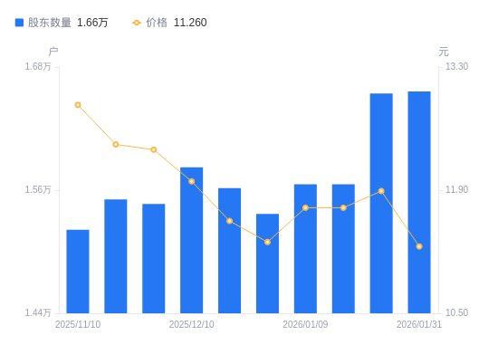 近一年(2025年2月28日至2026年1月31日),北鼎股份A股股东户数从1.63万户,增加至1.66万户,增幅1.87%,区间股价上涨21.91%。