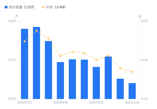 近一年(2024年11月29日至2025年11月28日),派瑞股份A股股东户数从3.82万户,减低至3.1万户,降幅18.88%,区间股价下跌12.56%。