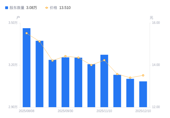 12月11日消息,数据显示,截至2025年12月10日,派瑞股份A股股东总户数为3.08万户,较上期(2025年11月28日)减少182户,降幅0.59%。公司最新A股总股本为3.2亿股,其中流通A股1.84亿股,户均持有流通A股数量为5982.56股,较上期增加35.1股,增幅0.59%;户均持流通A股市值8.08万元,较上期增加1128.45元,增幅1.42%。