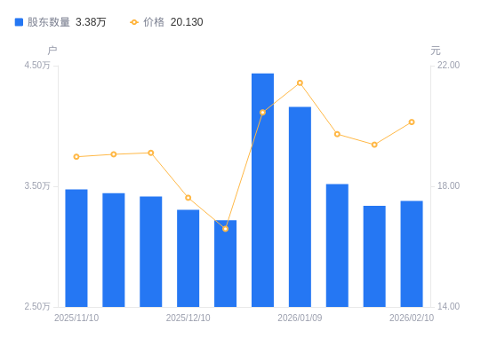 近一年(2025年2月10日至2026年2月10日),酷特智能A股股东户数从4.67万户,减低至3.38万户,降幅27.57%,区间股价下跌27.69%。