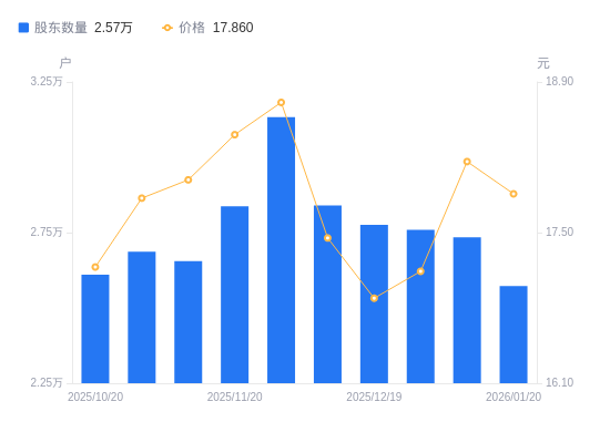 近一年(2025年1月20日至2026年1月20日),中船汉光A股股东户数从2.57万户,增加至2.57万户,增幅0.29%,区间股价上涨8.55%。