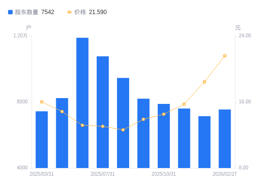 近一年(2025年2月28日至2026年2月27日),锦盛新材A股股东户数从7729户,减低至7542户,降幅2.42%,区间股价上涨55.88%。