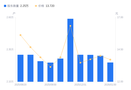 近一年(2025年2月10日至2026年1月30日),科思股份A股股东户数从2.24万户,增加至2.25万户,增幅0.45%,区间股价下跌24.35%。