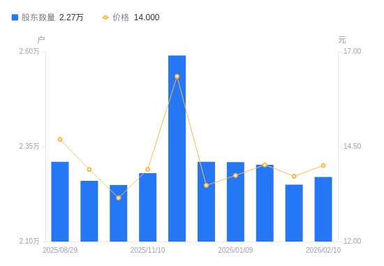 近一年(2025年2月10日至2026年2月10日),科思股份A股股东户数从2.24万户,增加至2.27万户,增幅1.34%,区间股价下跌22.81%。