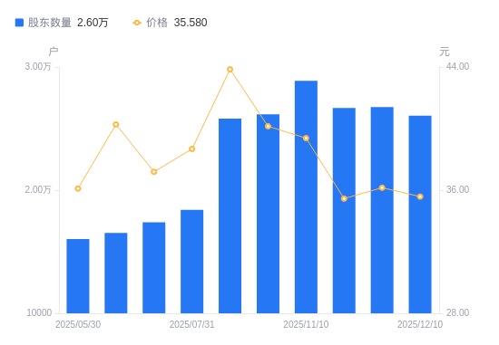 近一年(2024年12月20日至2025年12月10日),西域旅游A股股东户数从1.29万户,增加至2.6万户,增幅101.84%,区间股价下跌13.18%。