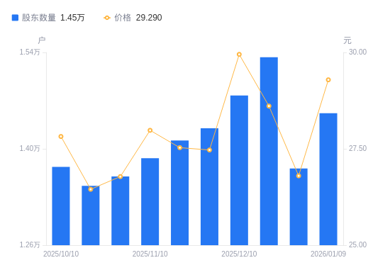 近一年(2024年12月31日至2025年12月31日),锋尚文化A股股东户数从1.72万户,减低至1.37万户,降幅20.40%,区间股价下跌6.04%。