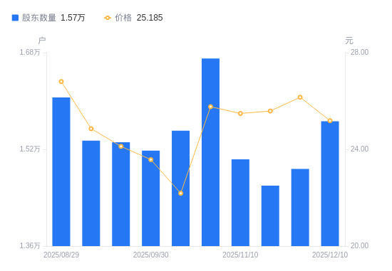 近一年(2024年12月10日至2025年12月10日),蓝盾光电A股股东户数从1.54万户,增加至1.57万户,增幅1.71%,区间股价下跌15.16%。