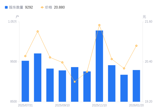 近一年(2025年2月28日至2026年1月20日),南大环境A股股东户数从9011户,增加至9292户,增幅3.12%,区间股价上涨2.55%。