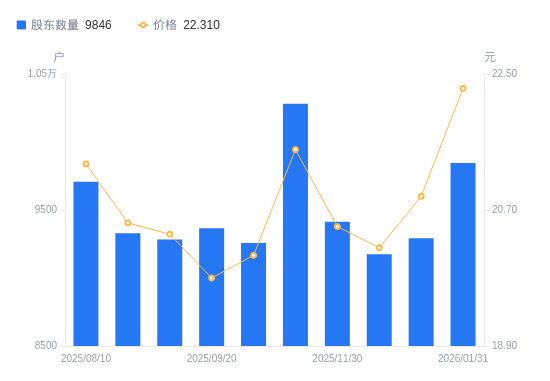 近一年(2025年2月28日至2026年1月31日),南大环境A股股东户数从9011户,增加至9846户,增幅9.27%,区间股价上涨9.58%。