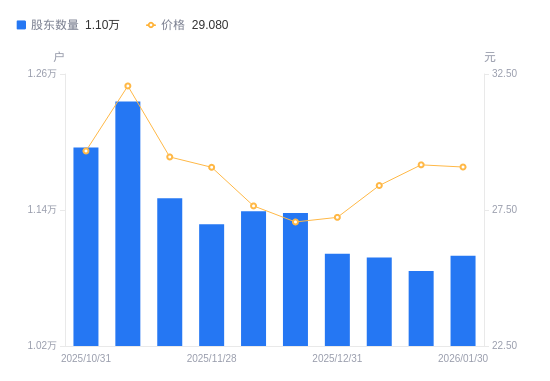 近一年(2025年2月10日至2026年1月30日),大宏立A股股东户数从1.08万户,增加至1.1万户,增幅2.04%,区间股价上涨21.78%。