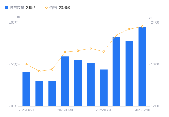 近一年(2024年12月10日至2025年12月10日),圣元环保A股股东户数从2.08万户,增加至2.95万户,增幅41.49%,区间股价上涨64.42%。