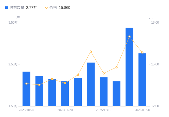 近一年(2025年1月27日至2026年1月20日),狄耐克A股股东户数从1.97万户,增加至2.77万户,增幅40.36%,区间股价上涨50.76%。