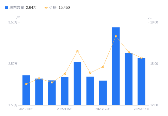 近一年(2025年2月28日至2026年1月30日),狄耐克A股股东户数从1.91万户,增加至2.64万户,增幅38.18%,区间股价上涨28.00%。