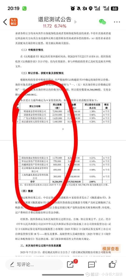 : 谱尼测试历史上有过一次询价转让,就是去年7月21号披露,7月29号完成,受让方是图中这些公司,当时股价走势并无变化,只是这次比上次转让的多一些。
