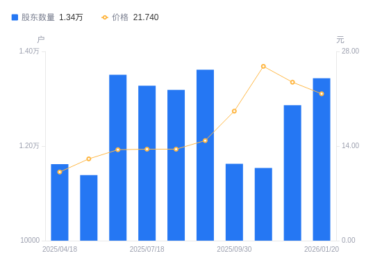 近一年(2025年1月20日至2026年1月20日),爱克股份A股股东户数从1.28万户,增加至1.34万户,增幅5.23%,区间股价上涨138.72%。