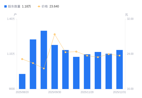 近一年(2024年12月31日至2025年12月31日),松原安全A股股东户数从6486户,增加至1.18万户,增幅81.79%,区间股价上涨54.70%。