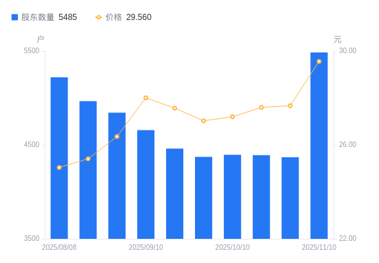 近一年(2024年12月31日至2025年11月10日),*ST凯鑫A股股东户数从9161户,减低至5485户,降幅40.13%,区间股价上涨38.65%。