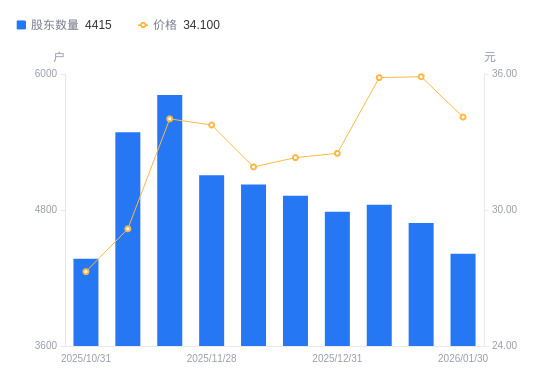 2月3日消息,数据显示,截至2026年1月30日,*ST凯鑫A股股东总户数为4415户,较上期(2026年1月20日)减少270户,降幅5.76%。公司最新A股总股本为6378.35万股,其中流通A股4093.61万股,户均持有流通A股数量为9272.04股,较上期增加534.35股,增幅6.12%;户均持流通A股市值31.62万元,较上期增加2668.41元,增幅0.85%。
