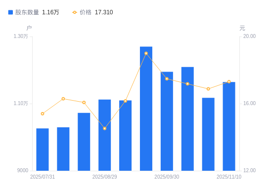 近一年(2024年12月31日至2025年11月10日),凯龙高科A股股东户数从1.11万户,增加至1.16万户,增幅4.73%,区间股价上涨46.57%。