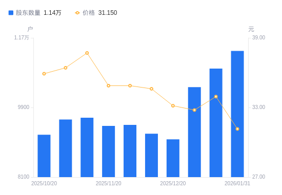 近一年(2025年2月10日至2026年1月31日),朗特智能A股股东户数从1.45万户,减低至1.14万户,降幅21.68%,区间股价下跌0.54%。