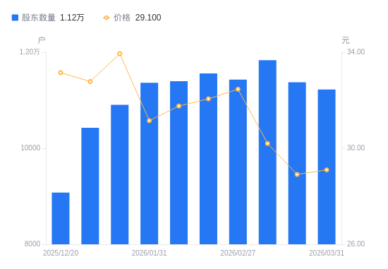 4月2日消息,数据显示,截至2026年3月31日,朗特智能A股股东总户数为1.12万户,较上期(2026年3月20日)减少150户,降幅1.32%。公司最新A股总股本为1.45亿股,其中流通A股9342.52万股,户均持有流通A股数量为8323.7股,较上期增加109.77股,增幅1.34%;户均持流通A股市值24.22万元,较上期增加4755.03元,增幅2.00%。