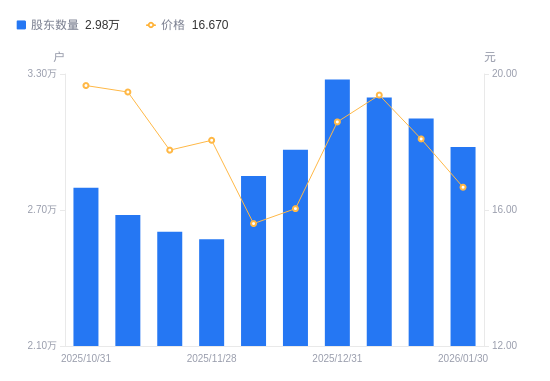 2月10日消息,数据显示,截至2026年2月10日,南山智尚A股股东总户数为3.01万户,较上期(2026年1月30日)增加294户,增幅0.99%。公司最新A股总股本为5.06亿股,其中流通A股5.06亿股,户均持有流通A股数量为1.68万股,较上期减少166.15股,降幅0.98%;户均持流通A股市值29.91万元,较上期增加1.57万元,增幅5.56%。