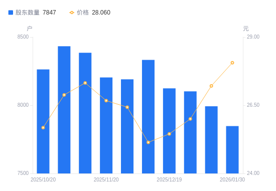 近一年(2025年2月28日至2026年1月30日),研奥股份A股股东户数从8965户,减低至7847户,降幅12.47%,区间股价上涨36.39%。
