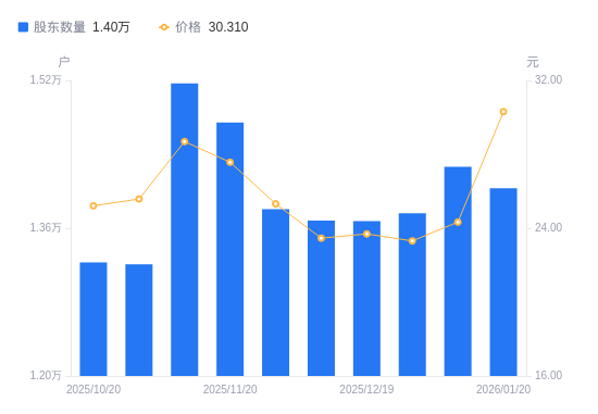 1月21日消息,数据显示,截至2026年1月20日,江天化学A股股东总户数为1.4万户,较上期(2026年1月9日)减少233户,降幅1.63%。公司最新A股总股本为1.44亿股,其中流通A股1.41亿股,户均持有流通A股数量为1万股,较上期增加163.98股,增幅1.66%;户均持流通A股市值30.43万元,较上期增加6.4万元,增幅26.65%。