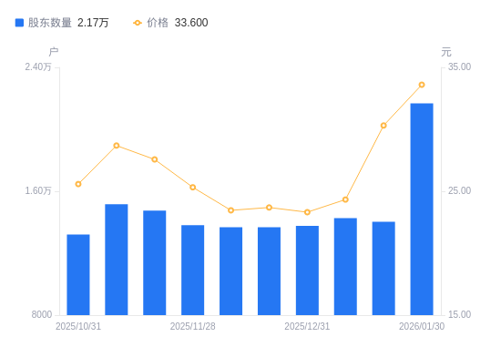 2月2日消息,数据显示,截至2026年1月30日,江天化学A股股东总户数为2.17万户,较上期(2026年1月20日)增加7640户,增幅54.44%。公司最新A股总股本为1.44亿股,其中流通A股1.41亿股,户均持有流通A股数量为6500.67股,较上期减少3539.16股,降幅35.25%;户均持流通A股市值21.84万元,较上期减少8.59万元,降幅28.22%。