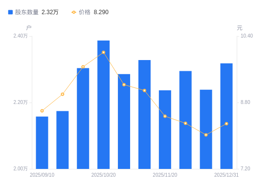1月8日消息,数据显示,截至2025年12月31日,中辰股份A股股东总户数为2.32万户,较上期(2025年12月19日)增加794户,增幅3.55%。公司最新A股总股本为5.47亿股,其中流通A股5.47亿股,户均持有流通A股数量为2.36万股,较上期减少837.12股,降幅3.43%;户均持流通A股市值19.57万元,较上期减少341.24元,降幅0.17%。