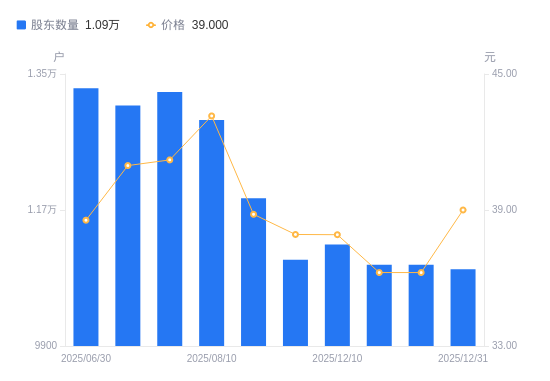 近一年(2024年12月31日至2025年12月31日),中英科技A股股东户数从1.29万户,减低至1.09万户,降幅15.25%,区间股价下跌2.03%。