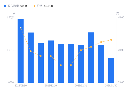 2月2日消息,数据显示,截至2026年1月30日,中英科技A股股东总户数为9909户,较上期(2026年1月20日)减少979户,降幅8.99%。公司最新A股总股本为7520万股,其中流通A股4746.03万股,户均持有流通A股数量为4789.61股,较上期增加430.66股,增幅9.88%;户均持流通A股市值19.59万元,较上期增加1.94万元,增幅10.97%。