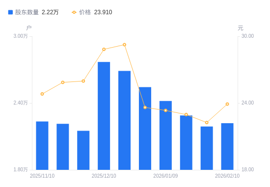 近一年(2025年2月28日至2026年2月10日),创识科技A股股东户数从2.37万户,减低至2.22万户,降幅6.36%,区间股价下跌9.96%。