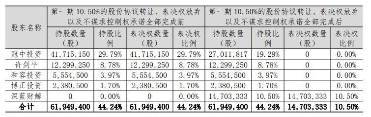 与典型的控股权收购不同,交易中设计了“股份转让+表决权放弃”的组合方案。转让完成后,深蓝财鲸将持股10.5%,并通过原股东放弃33.74%股份表决权的安排,成为冠中生态实际控股股东。