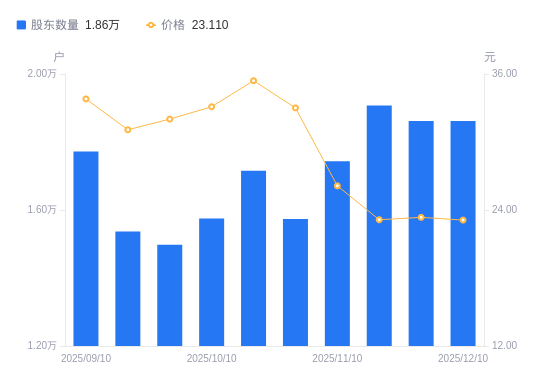 近一年(2024年12月10日至2025年12月10日),德固特A股股东户数从1.41万户,增加至1.86万户,增幅32.26%,区间股价上涨32.50%。
