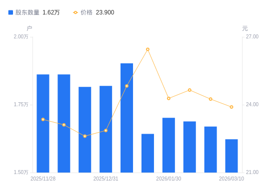 3月11日消息,数据显示,截至2026年3月10日,德固特A股股东总户数为1.62万户,较上期(2026年2月13日)减少469户,降幅2.81%。公司最新A股总股本为1.53亿股,其中流通A股9096.28万股,户均持有流通A股数量为5605.99股,较上期增加157.48股,增幅2.89%;户均持流通A股市值13.4万元,较上期增加1856.91元,增幅1.41%。