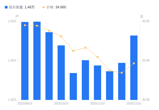 近一年(2024年12月10日至2025年12月10日),博硕科技A股股东户数从1.43万户,增加至1.46万户,增幅2.37%,区间股价上涨11.82%。