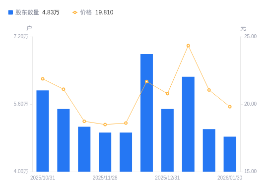 2月2日消息,数据显示,截至2026年1月30日,中洲特材A股股东总户数为4.83万户,较上期(2026年1月20日)减少1808户,降幅3.61%。公司最新A股总股本为4.59亿股,其中流通A股2.78亿股,户均持有流通A股数量为5764.03股,较上期增加208.02股,增幅3.74%;户均持流通A股市值11.42万元,较上期减少2768.5元,降幅2.37%。