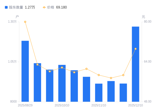 近一年(2024年12月10日至2025年12月10日),恒宇信通A股股东户数从5941户,增加至1.27万户,增幅113.68%,区间股价上涨104.55%。