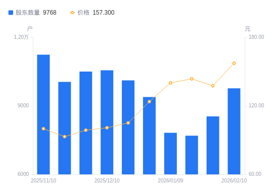 近一年(2025年2月10日至2026年2月10日),恒帅股份A股股东户数从6316户,增加至9768户,增幅54.65%,区间股价上涨113.85%。