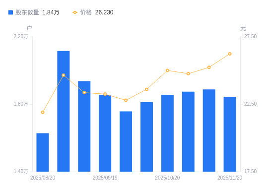 近一年(2024年11月20日至2025年11月20日),博亚精工A股股东户数从1.16万户,增加至1.84万户,增幅59.37%,区间股价上涨70.25%。