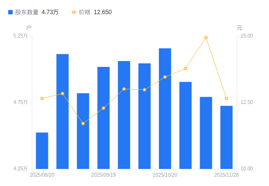 近一年(2024年12月20日至2025年11月28日),商络电子A股股东户数从5.25万户,减低至4.73万户,降幅9.92%,区间股价上涨6.50%。