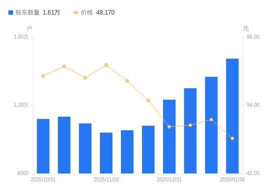 近一年(2025年2月20日至2026年1月30日),华利集团A股股东户数从9700户,增加至1.61万户,增幅65.98%,区间股价下跌26.97%。