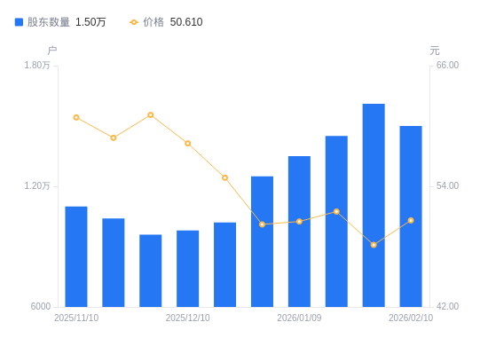 近一年(2025年2月20日至2026年2月10日),华利集团A股股东户数从9700户,增加至1.5万户,增幅54.64%,区间股价下跌23.27%。