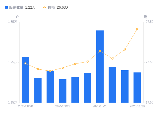 11月21日消息,数据显示,截至2025年11月20日,尤安设计A股股东总户数为1.22万户,较上期(2025年11月10日)减少53户,降幅0.43%。公司最新A股总股本为1.73亿股,其中流通A股1.07亿股,户均持有流通A股数量为8716.89股,较上期增加37.55股,增幅0.43%;户均持流通A股市值23.21万元,较上期增加2.31万元,增幅11.07%。