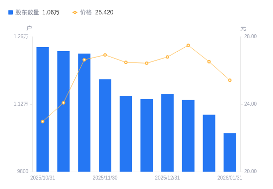 2月2日消息,数据显示,截至2026年1月31日,尤安设计A股股东总户数为1.06万户,较上期(2026年1月20日)减少381户,降幅3.47%。公司最新A股总股本为1.73亿股,其中流通A股1.07亿股,户均持有流通A股数量为1.01万股,较上期增加349.43股,增幅3.59%;户均持流通A股市值25.6万元,较上期减少1812.33元,降幅0.70%。