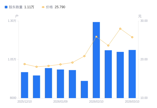 3月13日消息,数据显示,截至2026年3月10日,致远新能A股股东总户数为1.11万户,较上期(2026年2月27日)增加122户,增幅1.11%。公司最新A股总股本为1.87亿股,其中流通A股1.87亿股,户均持有流通A股数量为1.68万股,较上期减少186.06股,降幅1.10%;户均持流通A股市值43.26万元,较上期减少4.23万元,降幅8.90%。